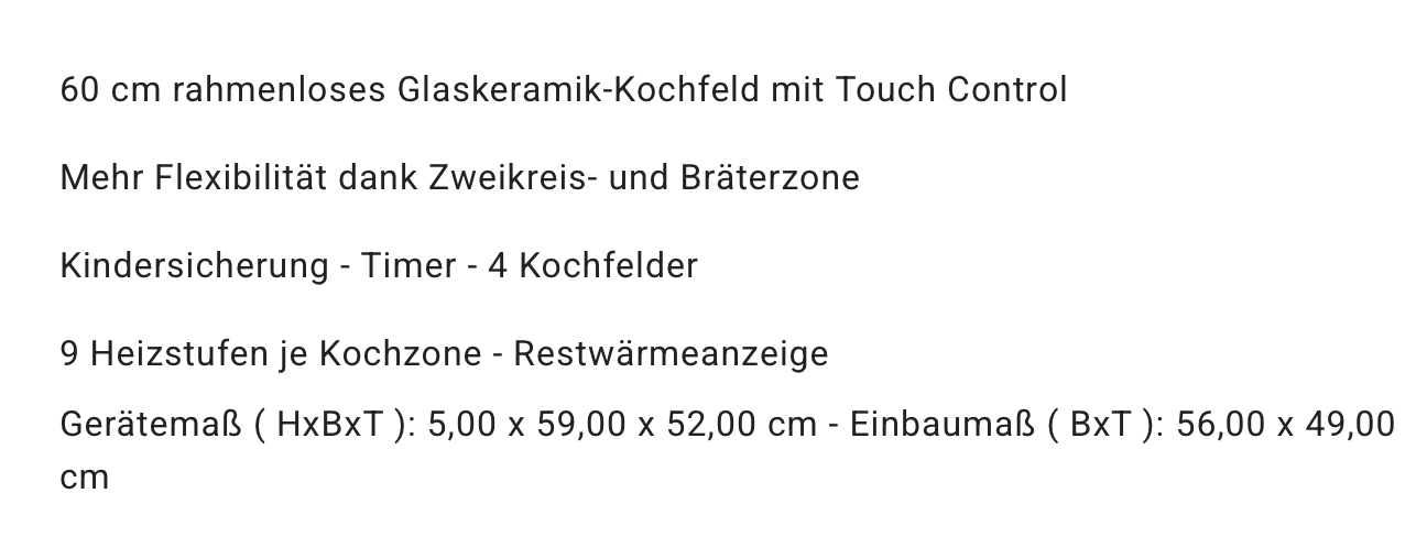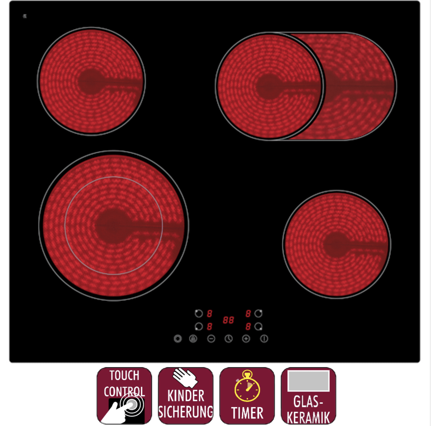 mit 4 Kochzonen (9 Heizstufen je Kochfeld), Restwärmeanzeige, Kindersicherung und Timer